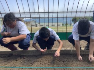 始めに、福光特産のにんじん「アロマレッド」の基礎知識や加工方法について講話をしていただきました。次に、ハウスに行き、アロマレッドの植え付け指導をしていただいたり、水やりの方法や雑草、虫害対策について助言をしていただいたりしました。生徒からは、「植え付けの間隔を確認してうまく植え付けができた。」「にんじん栽培の基礎知識を丁寧に教えてもらうことができてよかった。」などの感想がありました。