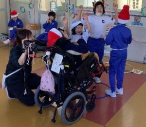 音楽発表では、「あわてんぼうのサンタクロース」「やまのおんがくか」の曲に合わせて歌ったり演奏したりしました。フープに付けられた「ベル」や「ローストチキン」などのイラストと同じ言葉をきいてチームのみんなで集まるゲームでは、友達と手をつないで集まったり、全員がそろうと「やったー」と喜んだりする姿が見られました。