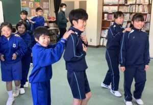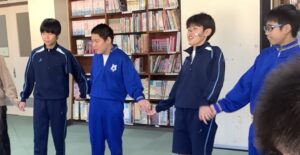 かもつ列車では、「かもつ列車」の歌に合わせて歩き、曲が止まると近くにいる友達とじゃんけん!!負けた生徒が勝った生徒の後ろにつながり、最後には部屋いっぱいに伸びる「かもつ列車」が完成し、大いに盛り上がり楽しむ姿が見られました。1回目の交流に比べて、お互いに積極的に自分から声を掛けて友達と関わる生徒が増え、とても有意義な時間となりました。