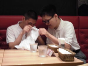 1日目の沢登りやハイキングでは、緑豊かな自然の中を歩き、全員目標地点に行くことができました。レクリエーション活動では、班対抗の「ひっくり返しゲーム」「3択クイズ」を行い、友達と勝つための作戦を立てたり、アドバイスし合ったりして仲間と協力して活動を楽しむことができました。また、係活動では、自分の仕事に責任をもってやり遂げる姿に、生徒一人一人の成長を見ることができました。