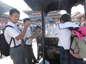 これから浅草寺へお参りに行きます! 煙を浴びたり、お参りをしたりしました!