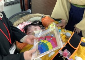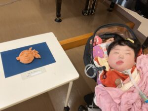 教師と一緒に粘土をこねたり、顔のパーツを一つ一つ丸めたりして作った立体作品と一緒に、記念撮影をしました。