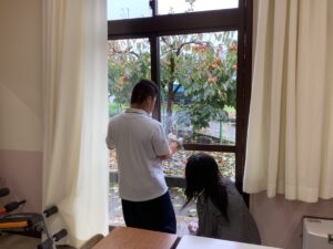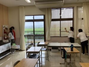 始めに、生活保健委員会主催の奉仕活動で、教室や廊下の窓拭きをしました。親子で協力して隅々まで拭き、窓がピカピカになりました。