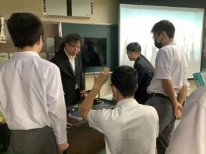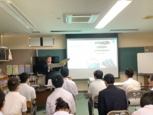 10月2日(木)高等部作業学習の受注班では、令和7年度次世代創出PBL推進事業の一環として、株式会社室屋 代表取締役社長 室谷 和典 様を講師にお招きし、商品完成までの流れや働く心構えについての授業を行いました。株式会社室屋様は箱折りを受注班に委託している会社であり、生徒たちは、普段気になっていたことを教えていただく機会となりました。